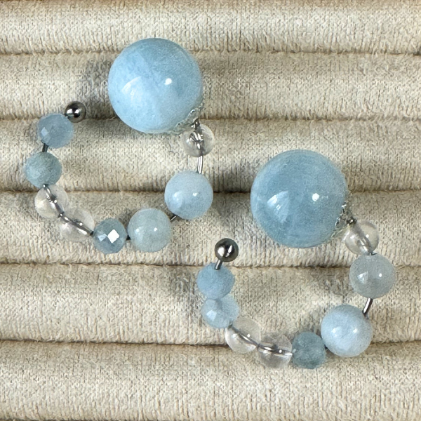 ミルキーなブルーが愛らしい上質なアクアマリン。 天然のホワイトが混ざり合った唯一無二の模様は、自然が生み出した芸術そのものです。 そこに透明感あふれる天然クリスタル(水晶)をアクセントに添え、凛とした佇まいのビューティーカフに仕上げました。