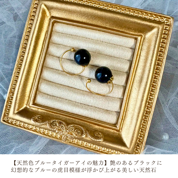 艶のあるブラックのベースに、幻想的なブルーの虎目模様が浮かび上がる美しい天然石。光の加減によって揺らめくように輝く「シャトヤンシー効果(キャッツアイ効果)」が特徴です。※見た目は、ほぼブラック(黒)です。